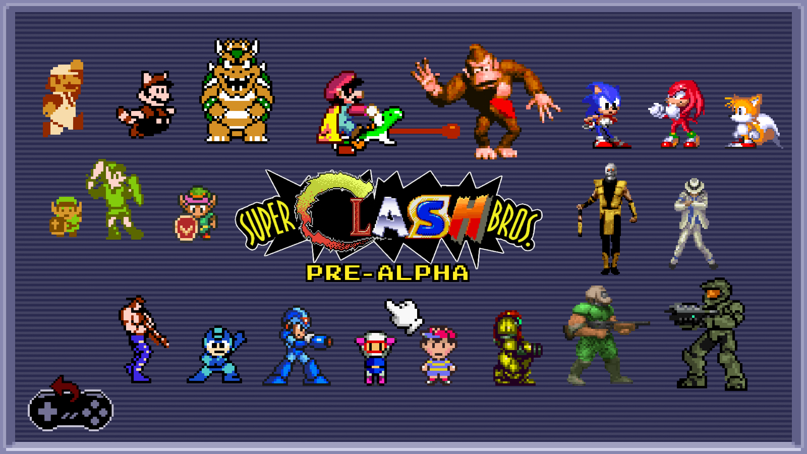 Super Clash Bros is a fangame inspired by Super Mario Crossover and Smash Bros. The characters are generally accurate & faithful recreations, including their controls, health systems, inventories, etc. from their games. The levels in adventure mode will be remakes from their games too.